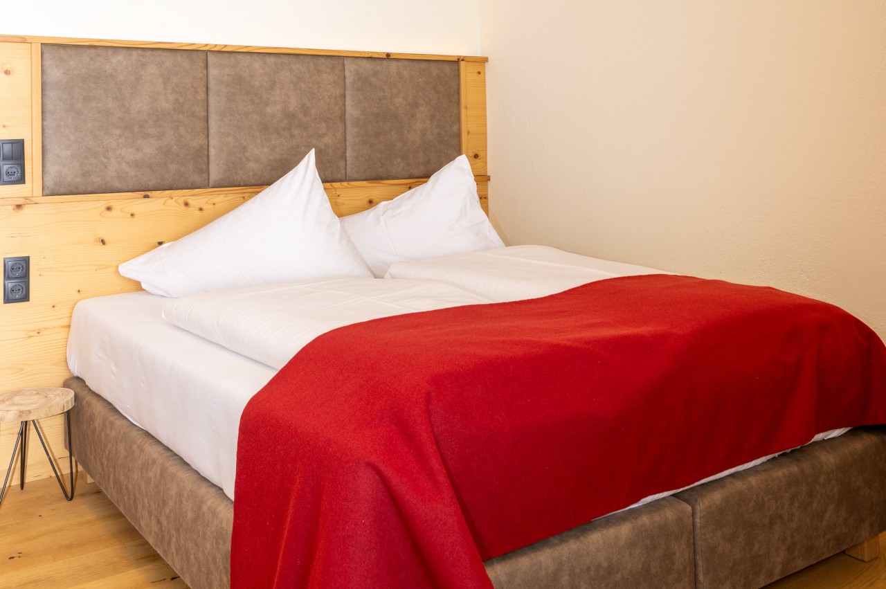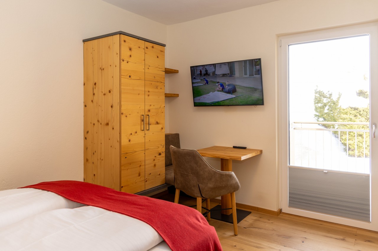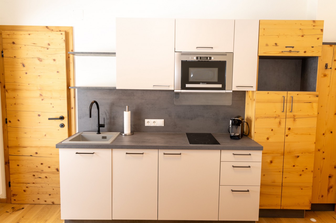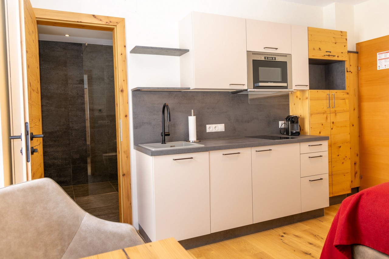 Unsere Appartements bestechen durch handgefertigte Vollholzeinrichtung aus heimischem Lärchen- oder Birkenholz.